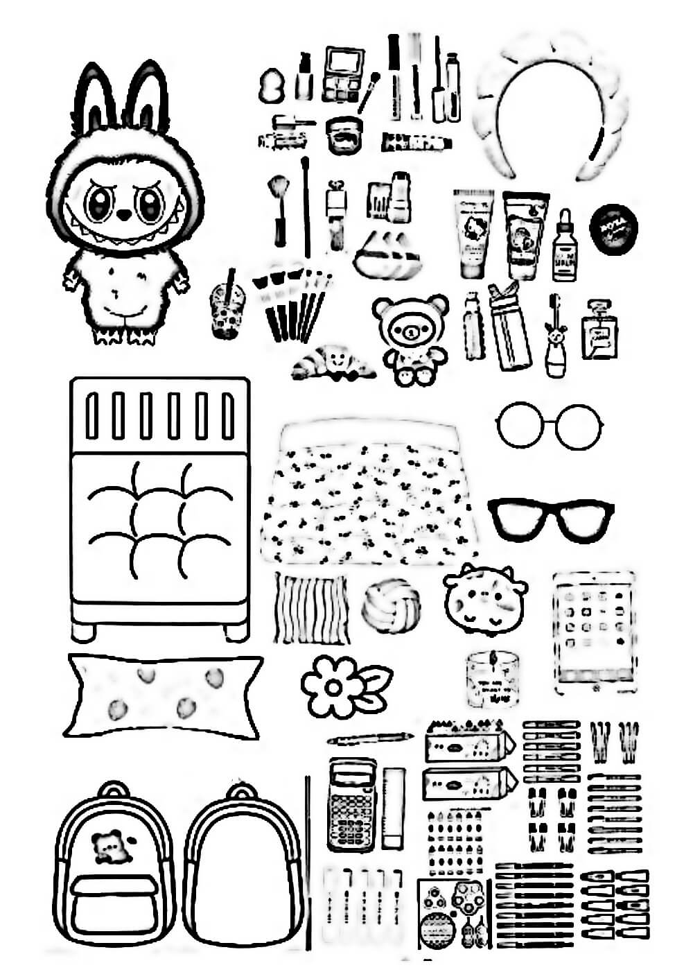 Лабубу – это мягкая игрушка в виде эльфа или монстра. У существа пушистое тело, большие глаза, острые уши и широкая зубастая улыбка. Образы были созданы гонконгским художником Касингом Луном в 2015 году. Что бы оживить чёрно белые картинки приготовьте карандаши, фломастеры, гелевые ручки, маркеры или краски.